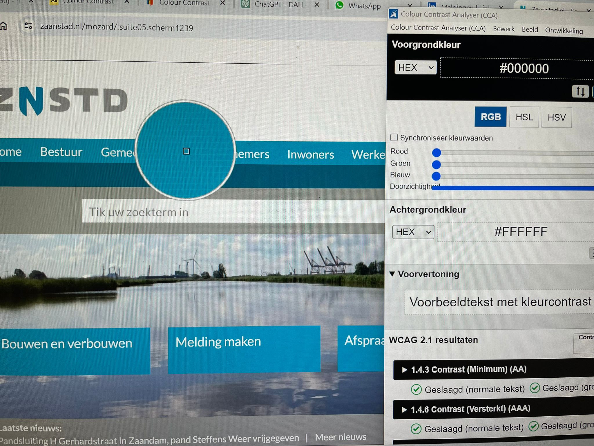 In dit voorbeeld van de gemeente Zaanstad (puur als voorbeeld omdat ik daar zelf woon), zie je dat het bij de kleinere lettertypes niet goed gaat qua contrast. Dus de hele kleine witte letters op de lichtblauwe achtergrond geeft onvoldoende contrast.